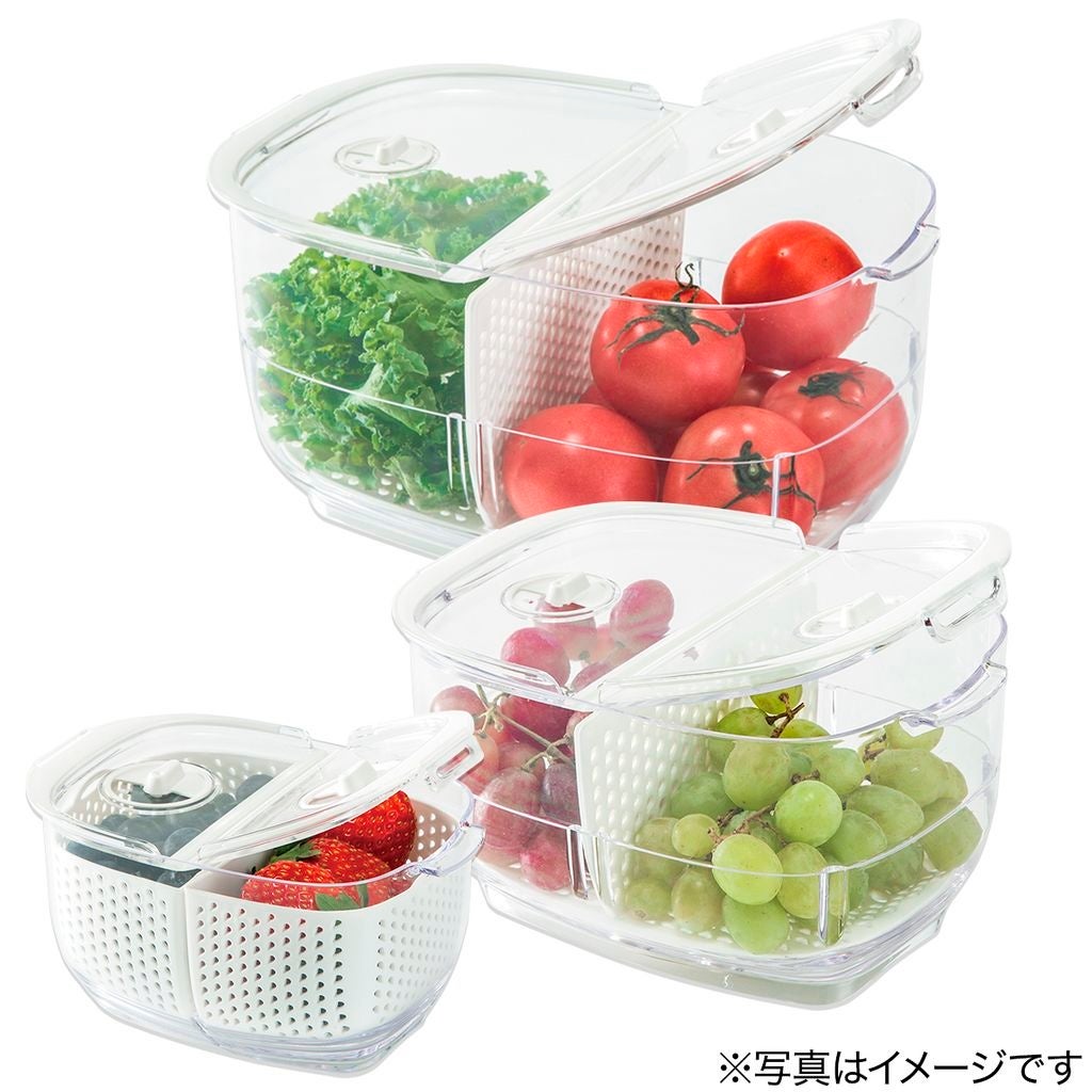 野菜や果物を洗って、そのまま冷蔵庫で保存できる容器。お客様からは、野菜の鮮度を維持できて、持ちが良くなったという声を多数いただいております。使いたいときにすぐ使えるので、時短便利アイテムとしてもおすすめです。冷蔵庫内の整理整頓にもぴったりで、年末年始の大掃除に大活躍いたします。