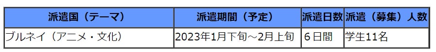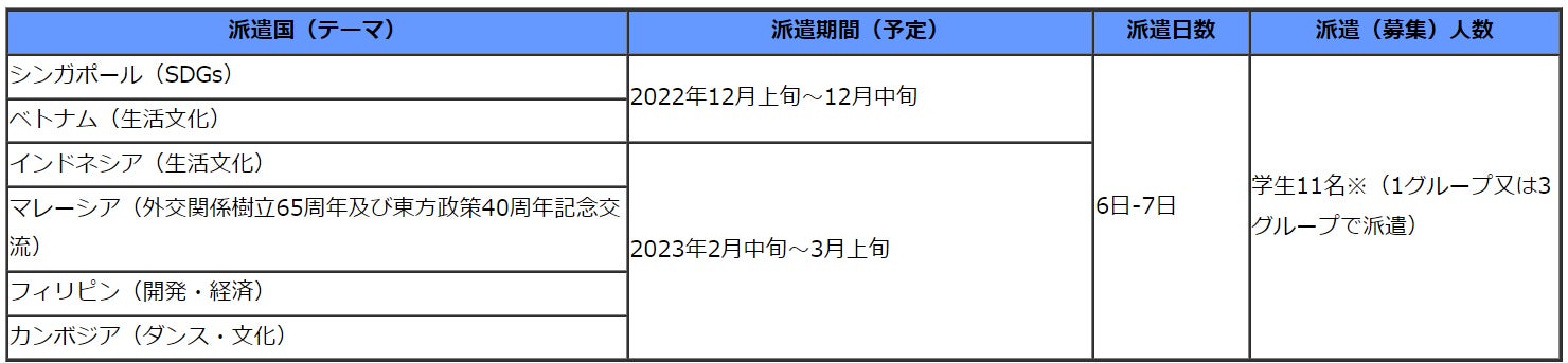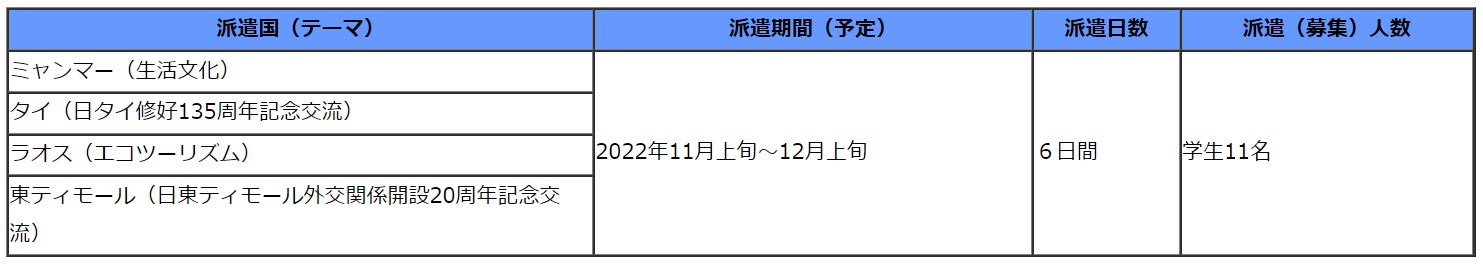 今次募集の派遣プログラムは、ASEAN諸国(ミャンマー、タイ、ラオス、ブルネイ、シンガポール、ベトナム、インドネシア、マレーシア、フィリピン、カンボジア)及び東ティモールの11ヶ国へ、将来を担う人材(高校生、専門学校生、大学生・大学院生等)を6-7日間程度派遣します。