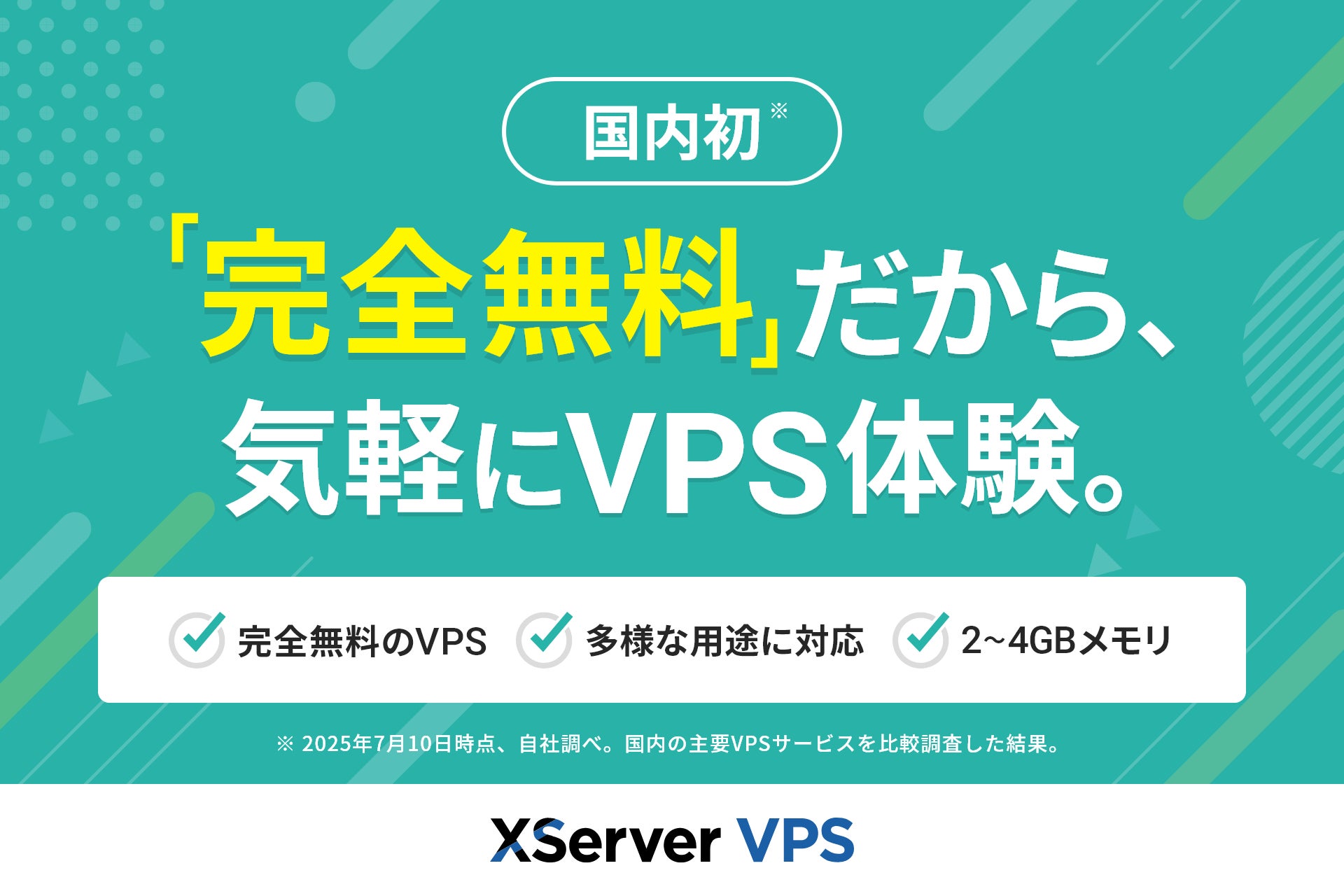 エックスサーバー株式会社(所在地:大阪市北区、代表取締役 小林 尚希)は、2025年7月10日、当社が提供するVPS(仮想専用サーバー)サービス『XServer VPS』において、国内初(※1)となる完全無料のVPS提供を開始しました。Webアプリ開発やAIツールの試用などの多様な用途において、コストをかけることなく高性能なVPS環境を手軽に利用・体験できる新たな選択肢を提供します。