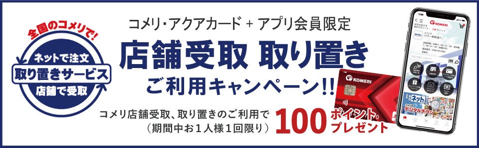 コメリドットコム大感謝祭と同期間『店舗受取・取り置きキャンペーン』を開催!期間中にコメリドットコムにて店舗受取注文またはコメリの取り置きサービスをご利用したお客様全員に、コメリの店舗で使用できるポイントを100ポイント(1ポイント=1円)プレゼント!※期間中何回利用してもポイント付与は1回のみとなります。