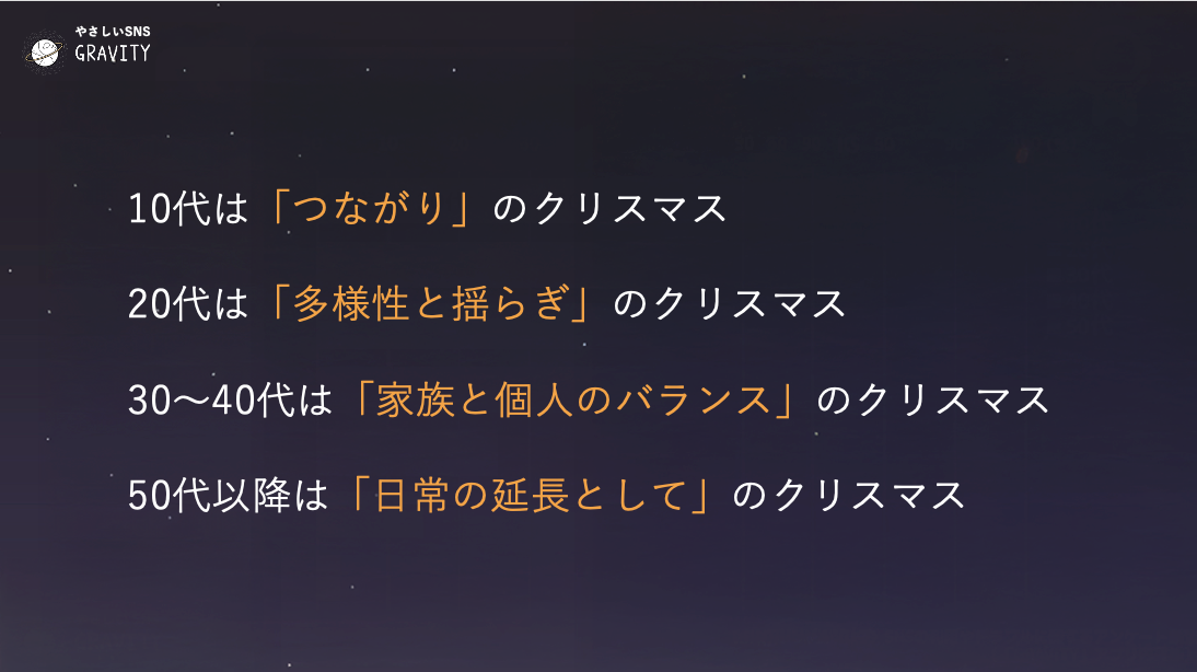 10代は「つながり」のクリスマス、20代は「多様性と揺らぎ」のクリスマス、30〜40代は「家族と個人のバランス」のクリスマス、50代以降は「日常の延長としてのクリスマス」
