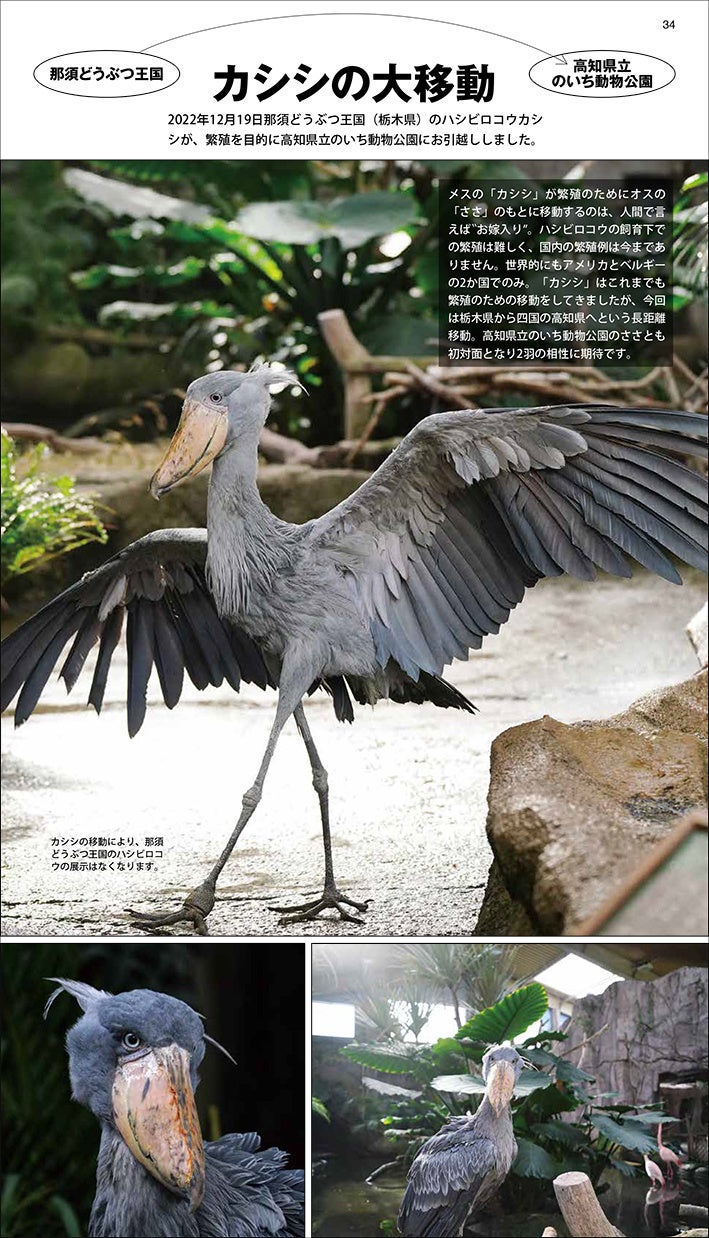 2024年版カレンダーは、高知県立のいち動物公園の「カシシ」が表紙を飾り、2023年12月~2024年12月まで13カ月のカレンダーに加え、国内のハシビロコウ繁殖の取り組みを紹介する「ハシビロNEWS」や、千葉市動物公園の「しずか」と「じっと」を取材した特集記事などの読み物も充実。