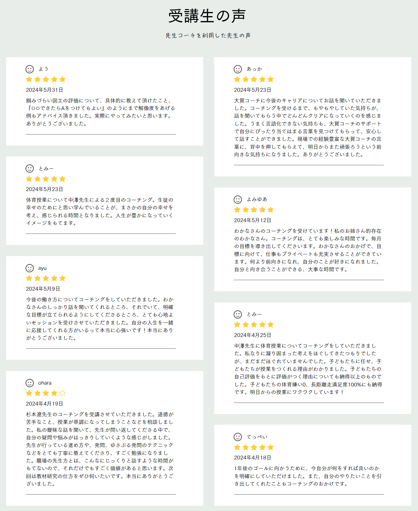 今後も悩みを抱える先生方に寄り添ったコーチングを提供できるよう努めていきます。