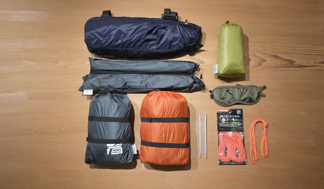 → 「ペグ」「細引き」「アイマスク」「ツーリングバッグ」の中からお好きな2点を選択