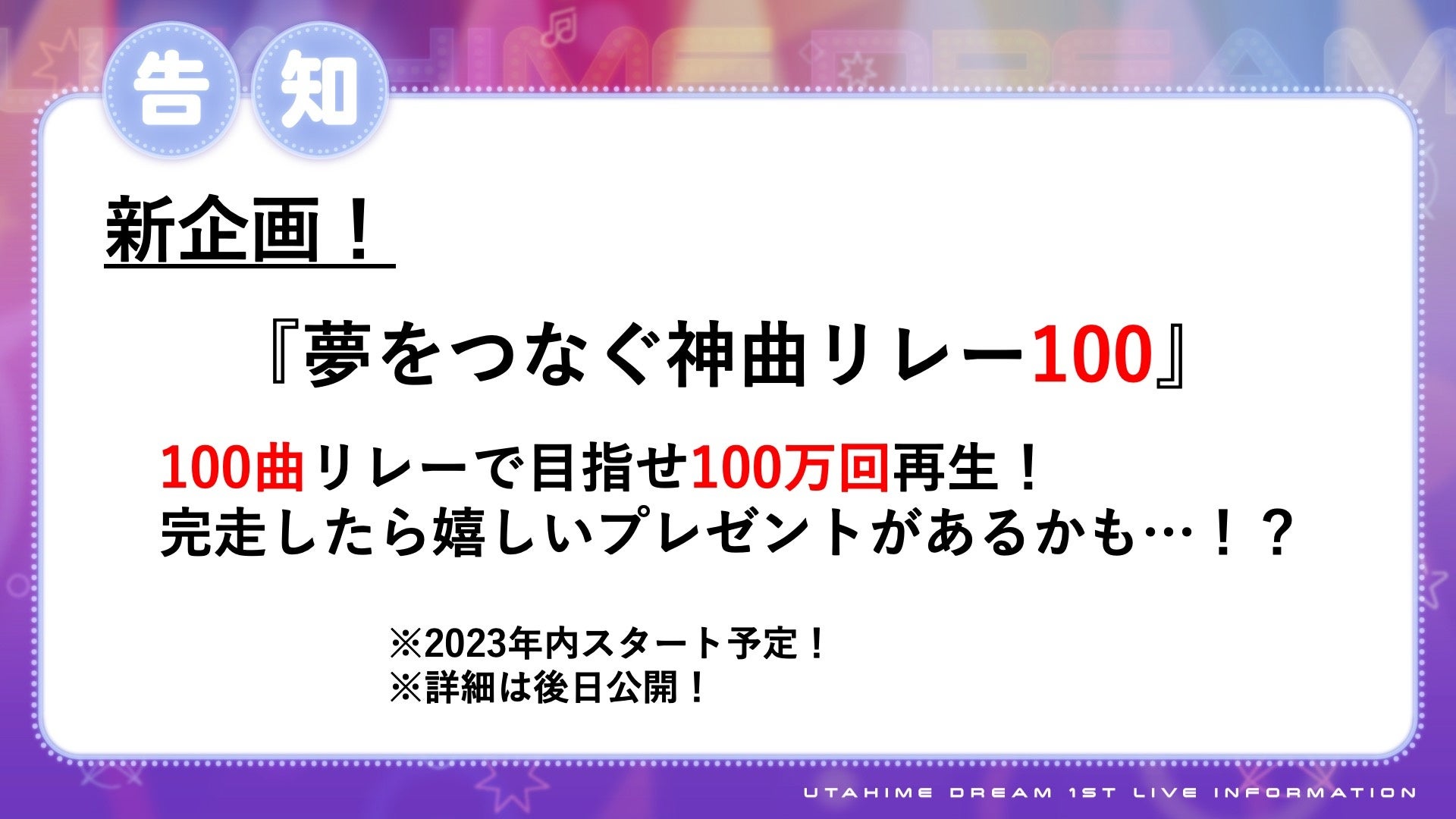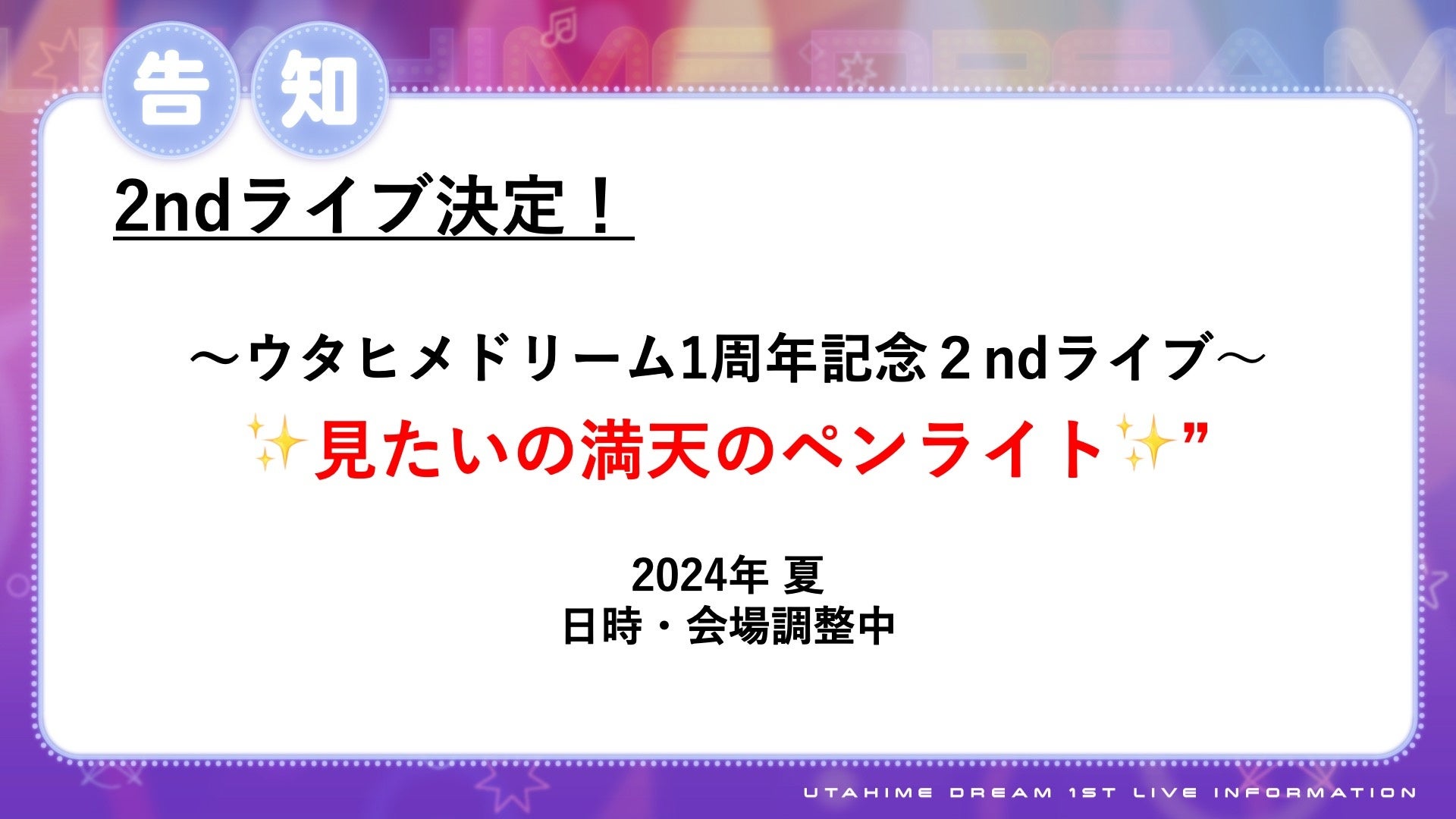 早くも、『ウタヒメドリーム』の2ndライブの開催が決定致しました!実施時期は『ウタヒメドリーム』が1周年を迎える、2024年夏を予定しております。