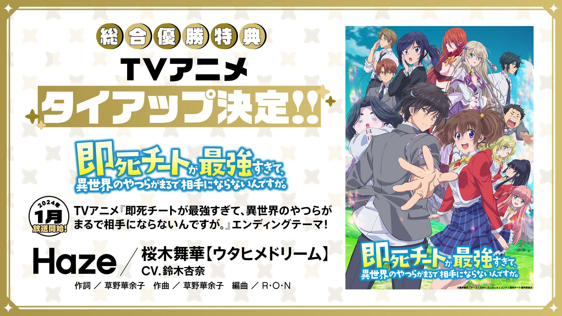 また「Haze」は、2024年1月から放送を開始するTVアニメ『即死チートが最強すぎて、異世界のやつらがまるで相手にならないんですが。』のエンディングテーマとして決定いたしました。
