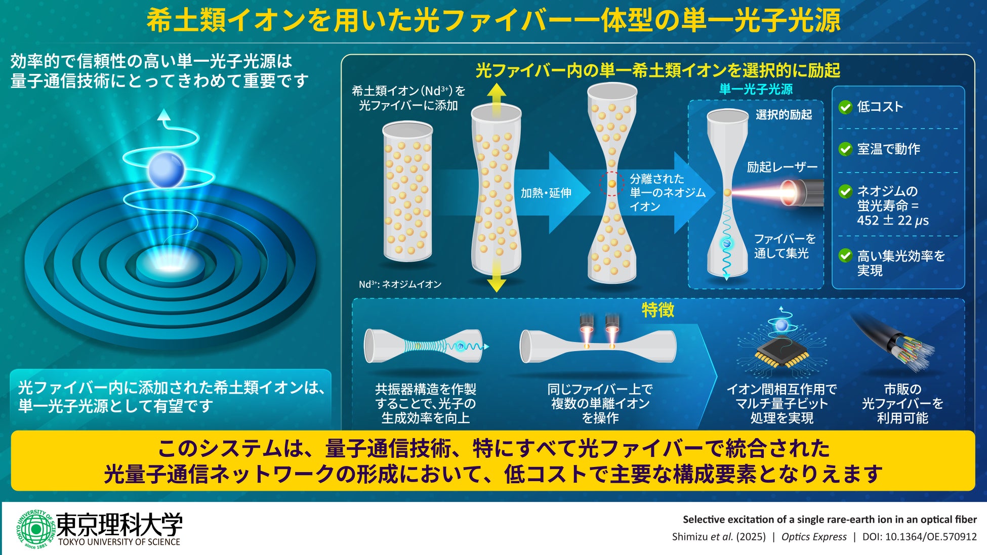 東京理科大学大学院 理学研究科 物理学専攻の清水 魁人氏(2025年度 博士課程3年)、同大学 理学部第一部 物理学科の長田 朋助教、佐中 薫准教授らの研究グループは、光ファイバーに添加されている希土類原子集団のうち、単一の希土類原子だけを狙い撃ちして励起することで、光ファイバー内に直接単一光子を生成し、効率的に導波させることに成功しました。