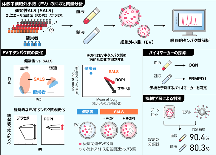 EVsは、ほとんどの細胞種から血液やCSFなどの体液中に分泌され、タンパク質や核酸などを内包していることから、細胞間の生体物質伝達に関わっているとされており、悪性腫瘍やSALSなどの神経変性疾患において疾患への寄与やバイオマーカーとしての有用性が推定されています。しかし、SALSにおける経時的かつ網羅的なEVタンパク質組成や、予後予測において有用なバイオマーカーはよく分かっていませんでした。また、ROPALS試験にて病態進行抑制効果が示唆されたROPIによるEVタンパク質組成変化は不明でした。今回、共同研究グループは、ROPALS試験のリバーストランスレーショナル研究(reverse translational research, rTR)として本研究を行い、経時的な患者由来体液を用いた網羅的なEVタンパク質組成を調べ、これらを明らかにしました。