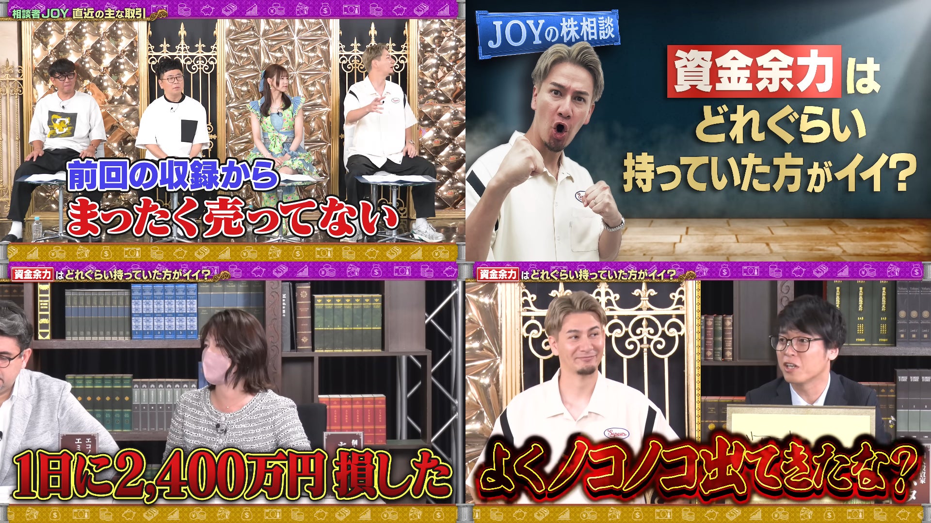 #1の相談者であるJOYさんは、特定の銘柄に集中投資をして値上がり益と配当金を狙う投資スタイルを実践中です。そのため資金に余裕がなく、他に良い銘柄を見つけても購入できないという悩みがあります。適切な資金余力はどの程度保つべきかという相談に、史上最強の投資家軍団のテスタ氏、エミン・ユルマズ氏、ちょる子氏の見解はいかに!?投資家軍団によるJOYさんへの辛口なツッコミも見どころです。