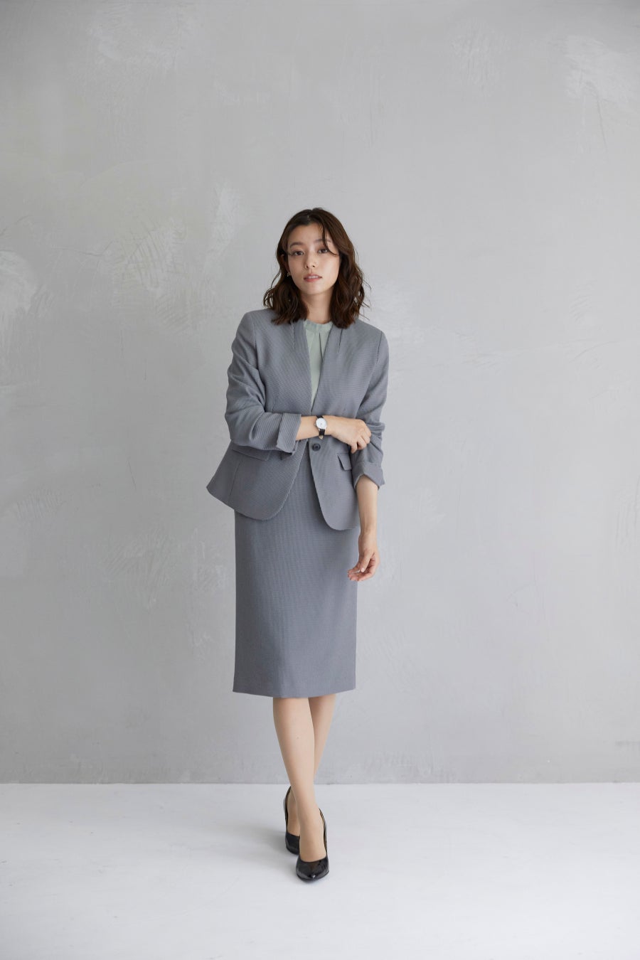 価格:1つボタンVカラージャケット15,290円(税込)/ワイドパンツ6,600円(税込)/タイトスカート6,600円(税込)