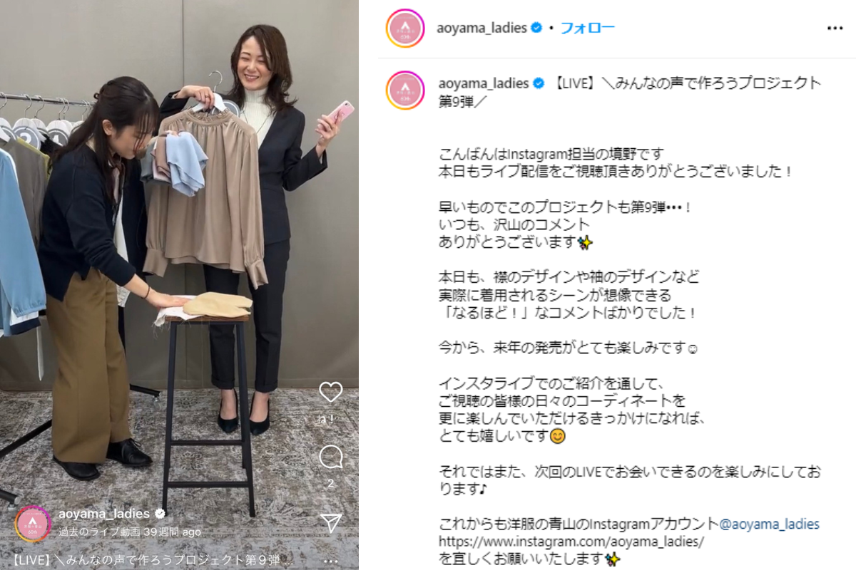 この共創企画は、インスタグラムのライブ配信を活用しフォロワーの方々と一緒にデザインやカラー、ネーミングなどについて直接意見を交換しながら、商品化をしています。これまでもバッグやニットなど様々な アイテムを企画し販売してきました。今回もインスタライブの中で、アンケートやヒアリングを繰り返し行いながら商品サンプルの修正を重ね、フォロワーの方々と一緒にこだわりのスーツを完成させました。