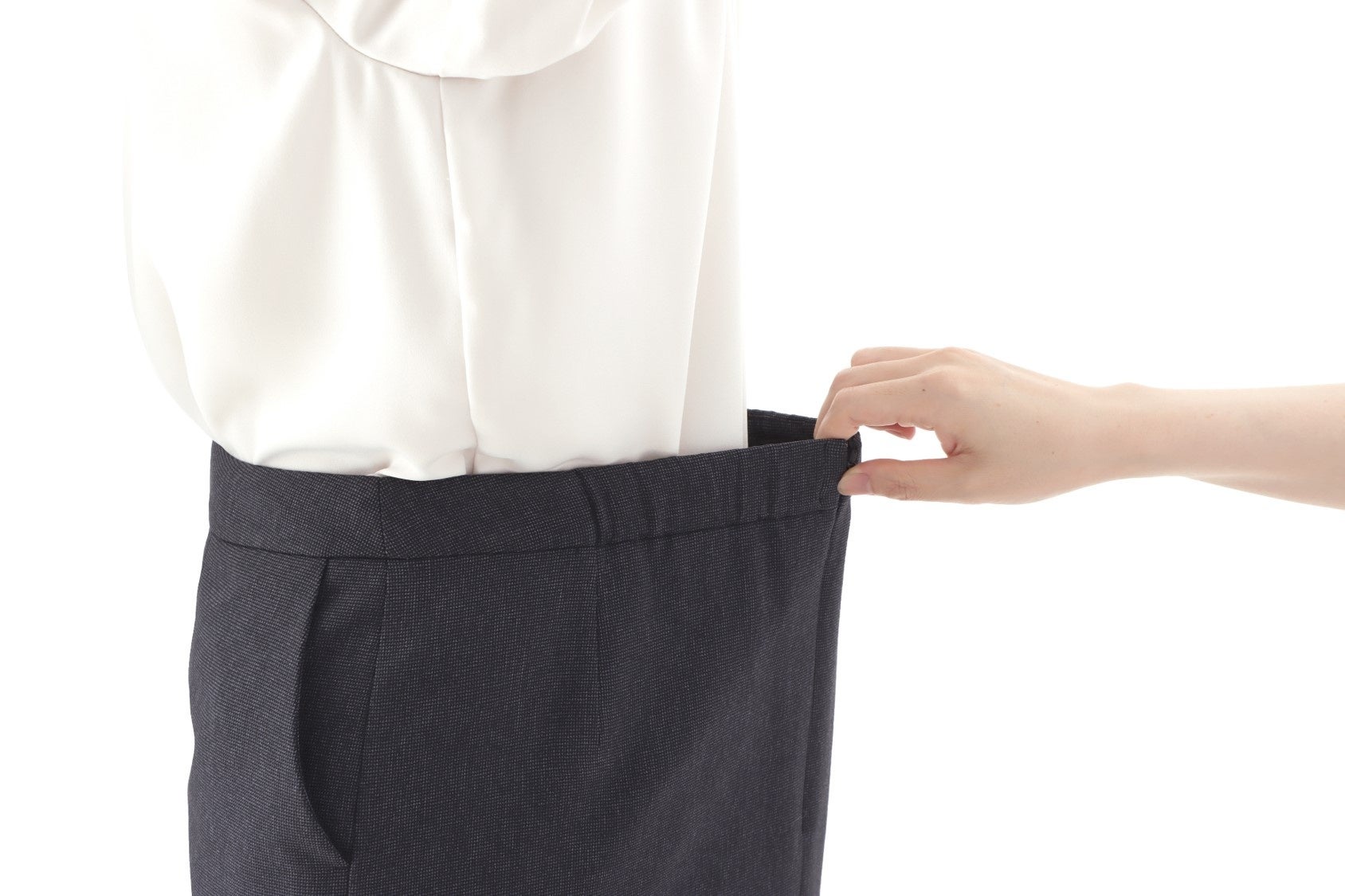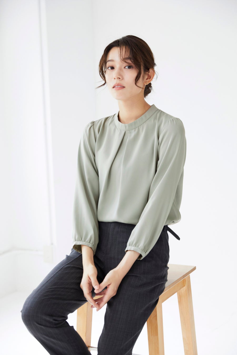 同企画の“『美ジ楽スーツ』に合う”をテーマに、フォロワーの方々の声を基に企画。Vカラージャケットを羽織った際にも胸元がきれい見えるようタックの幅や数を調整しました。首周りはハイネックにすることでお辞儀など前かがみになった際にも安心な仕様です。