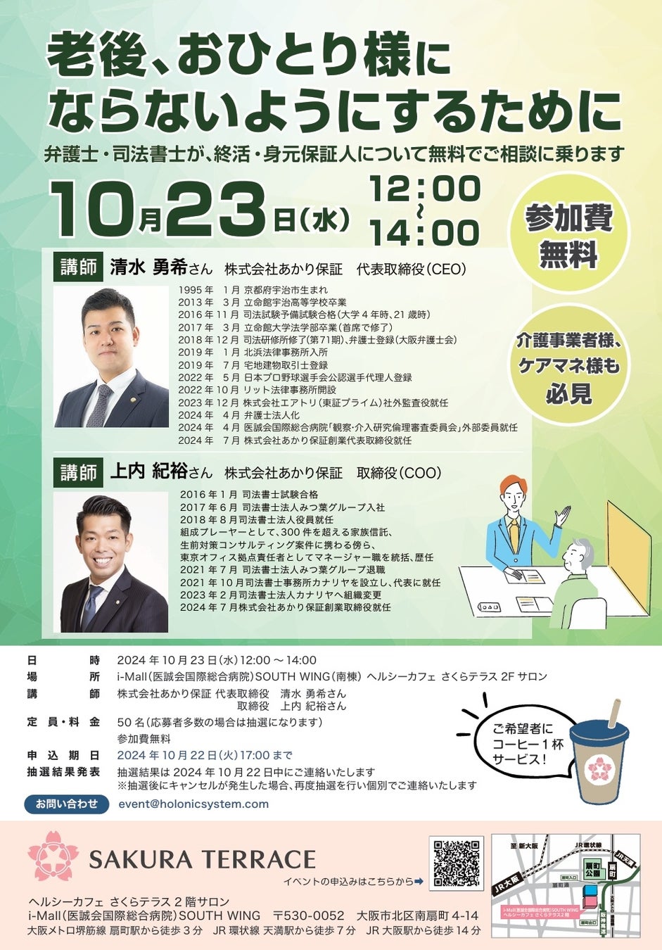 医療法人医誠会(本社:大阪府大阪市、代表者:谷幸治)が運営する医療複合施設「i-Mall」内のヘルシーカフェさくらテラスにて、高齢者やケアマネージャー、介護事業者を対象に、身元保証人や終活について専門家から直接学べるセミナーを開催します。弁護士や司法書士が講師として登壇し、相続や葬儀手続き、エンディングノートに関する不安を解消します。