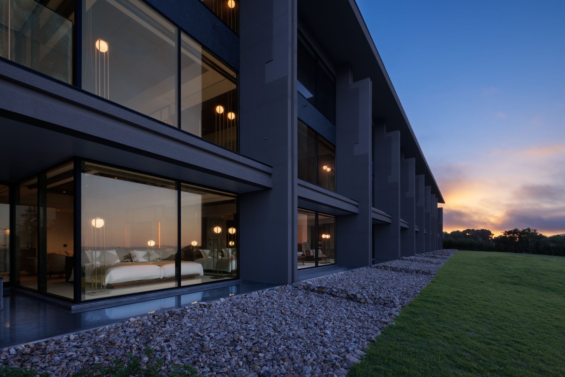 五島のシンボル「鬼岳」の噴火により形成されたとされる溶岩海岸を見下ろす高台に位置しています。内装設計とデザインを手がけた橋本夕紀夫氏がテーマに掲げたのは「The view」。どこまでも続く美しい海景、身体を包み込む海風。鐙瀬ならではのダイナミックで雄大な自然が主役となるようなデザインが、館内にちりばめられています。