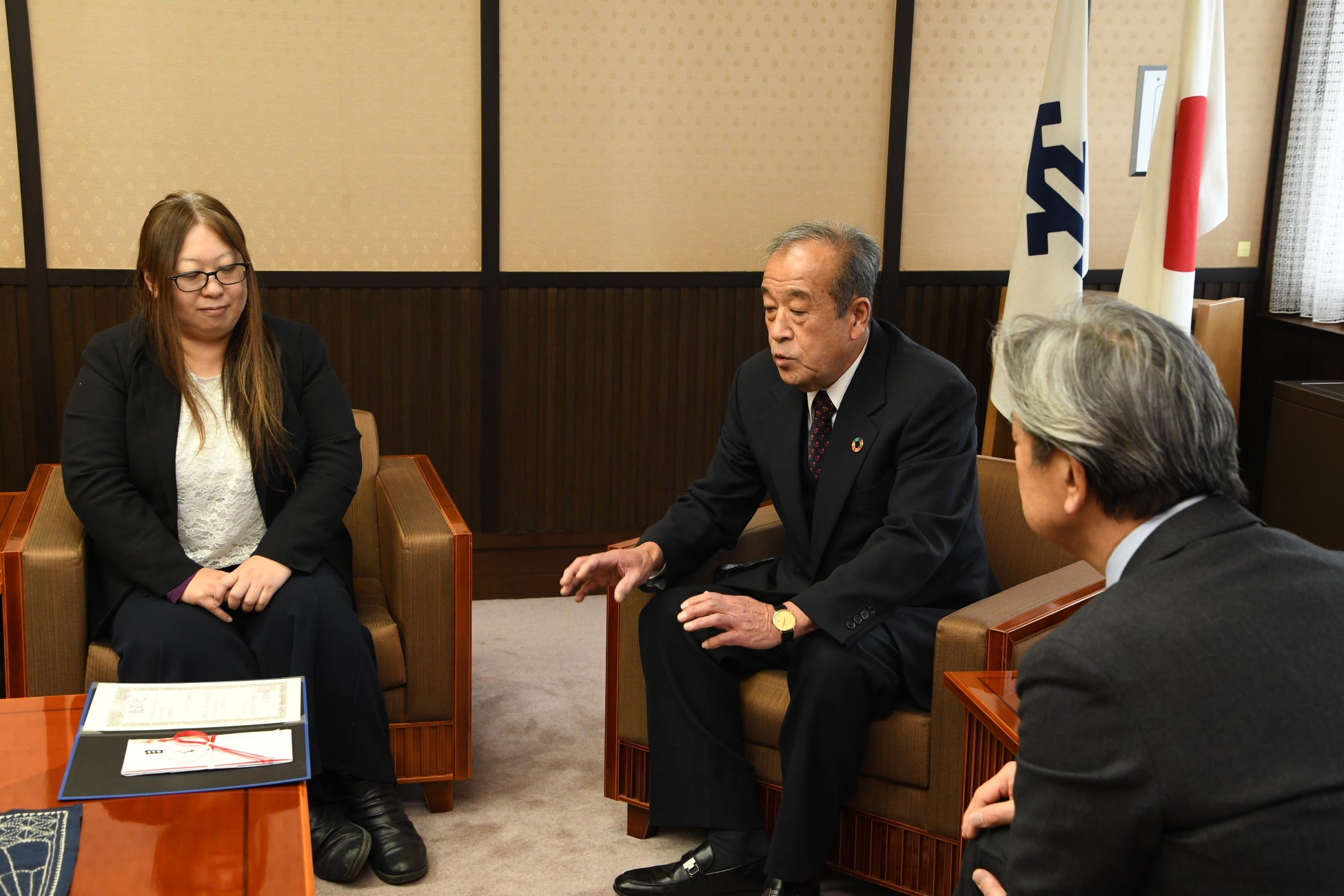 令和7年1月27日(月)に、大八まちづくり協議会の笠井新治会長と山本真紀事務局長が市役所を訪れ、受賞の喜びを田中明高山市長に報告しました。