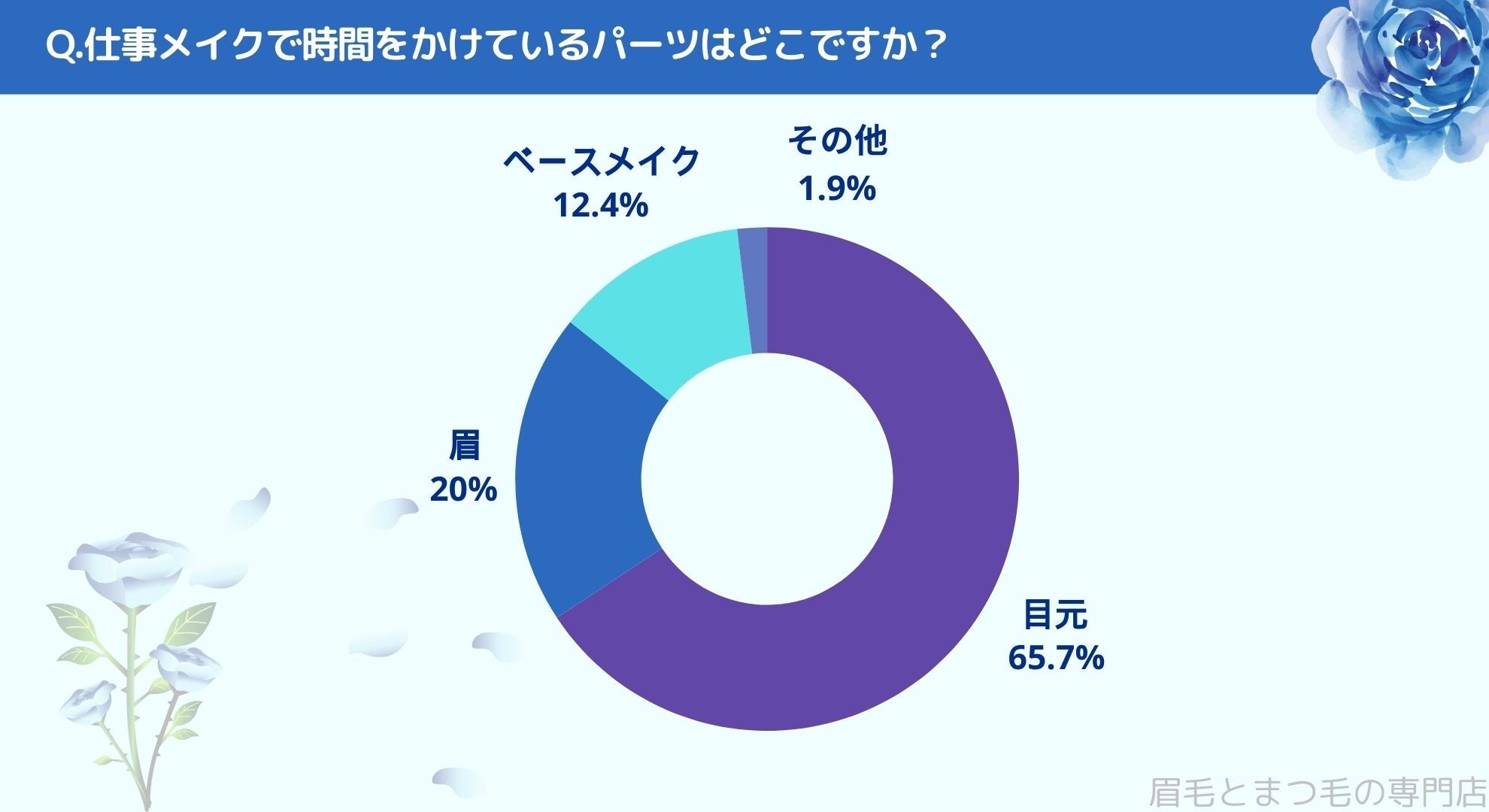 仕事メイクで時間をかけているパーツはどこかお聞きしたところ「目元(65.7%)」、「眉(20%)」、「ベースメイク(12.4%)」、「その他(1.9%)」という結果になりました。