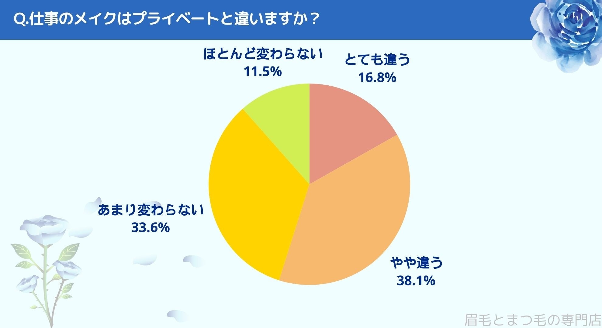 仕事のメイクはプライベートと違うかお聞きしたところ「とても違う(16.8%)」、「やや違う(38.1%)」、「あまり変わらない(33.6%)」、「ほとんど変わらない(11.5%)」という結果になりました。