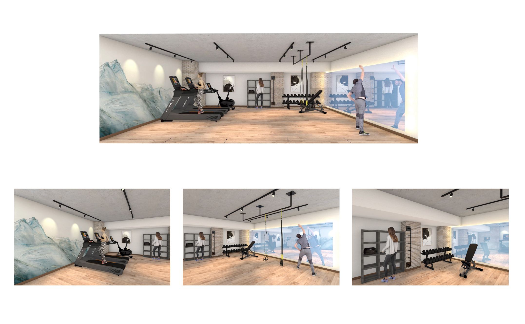 1. ニセコの象徴「山々」をモチーフにしたアーティスティックな内装 ジムの壁面には、ニセコの雄大な山脈をイメージしたダイナミックなグラフィックを配置。木目調のフロアと黒を基調としたシックな照明が、落ち着きと高揚感を同時に演出します。