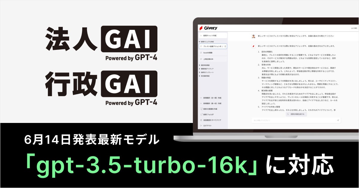 ギブリー、ChatGPT活用プラットフォーム法人GAI・行政GAIにて「gpt-3.5-turbo-16k」の対応を開始