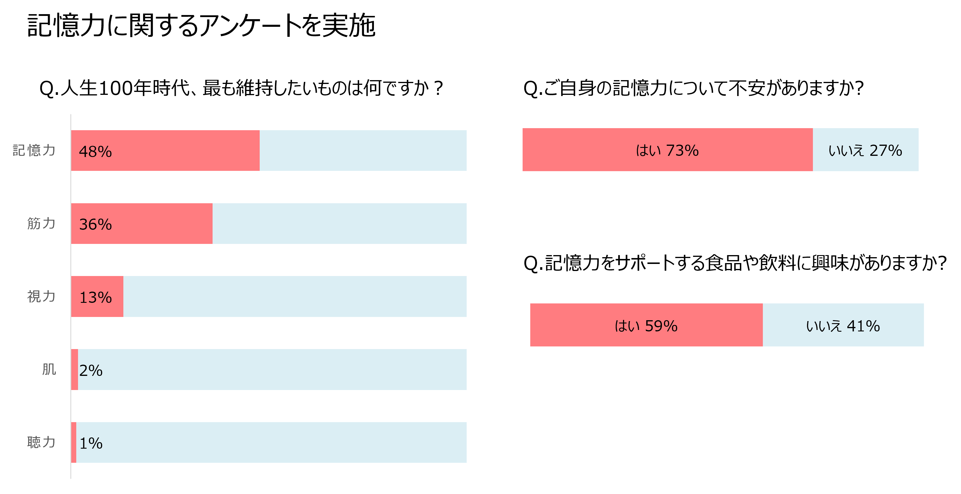 そんな現状から今回、弊社のお客様にアンケートを実施。人生100年時代と言われている今、お客様に記憶力、視力、聴力、筋力、肌の中で最も維持したいものは何かを質問した結果、約半数の方が最も維持したいものは「記憶力」でした。また、特に「ご自身の記憶力に不安がありますか?」の問いには70%以上の方が不安があるとの回答でした。さらに、「記憶力をサポートする食品、飲料に興味がありますか?」の問いに対して、約60%の方から興味があるという回答が得られました。