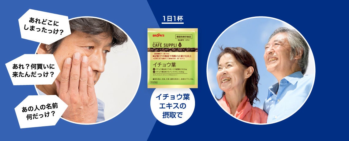 そこで毎日の一杯のコーヒーで、手軽に記憶力対策を目指して「カフェサプリ イチョウ葉」を開発いたしました。継続して飲んでいただくことで「あれ?何だっけ?」などの記憶についての不安を少しでも減らしていただけるよう記憶力※のサポートをいたします。