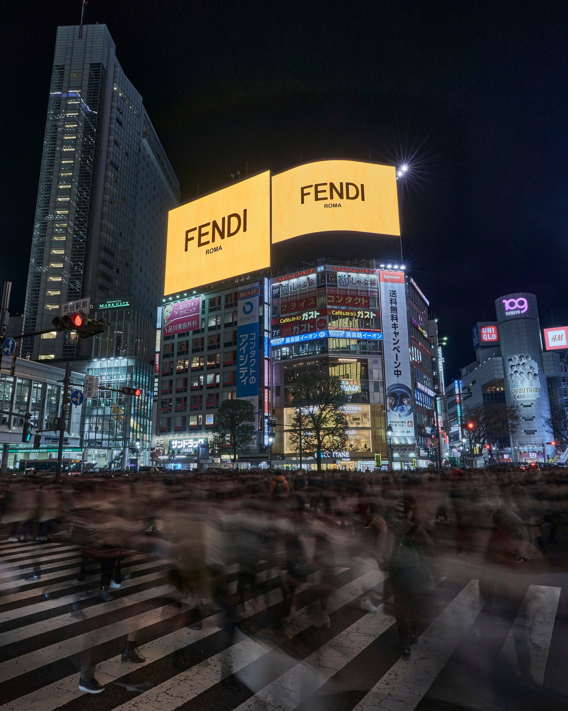続く3都市目となる東京・渋谷(Shibuya)のスクランブル交差点では、12月24日(金)と25日(土)の夜8つの大型デジタルサイネージを、永遠の都を染める夕焼けからインスピレーションを得て誕生したフェンディのアイコニックなローマンイエローで埋め尽くし、クリスマスを祝う多くの人々で賑わった渋谷の夜空を照らしました。
