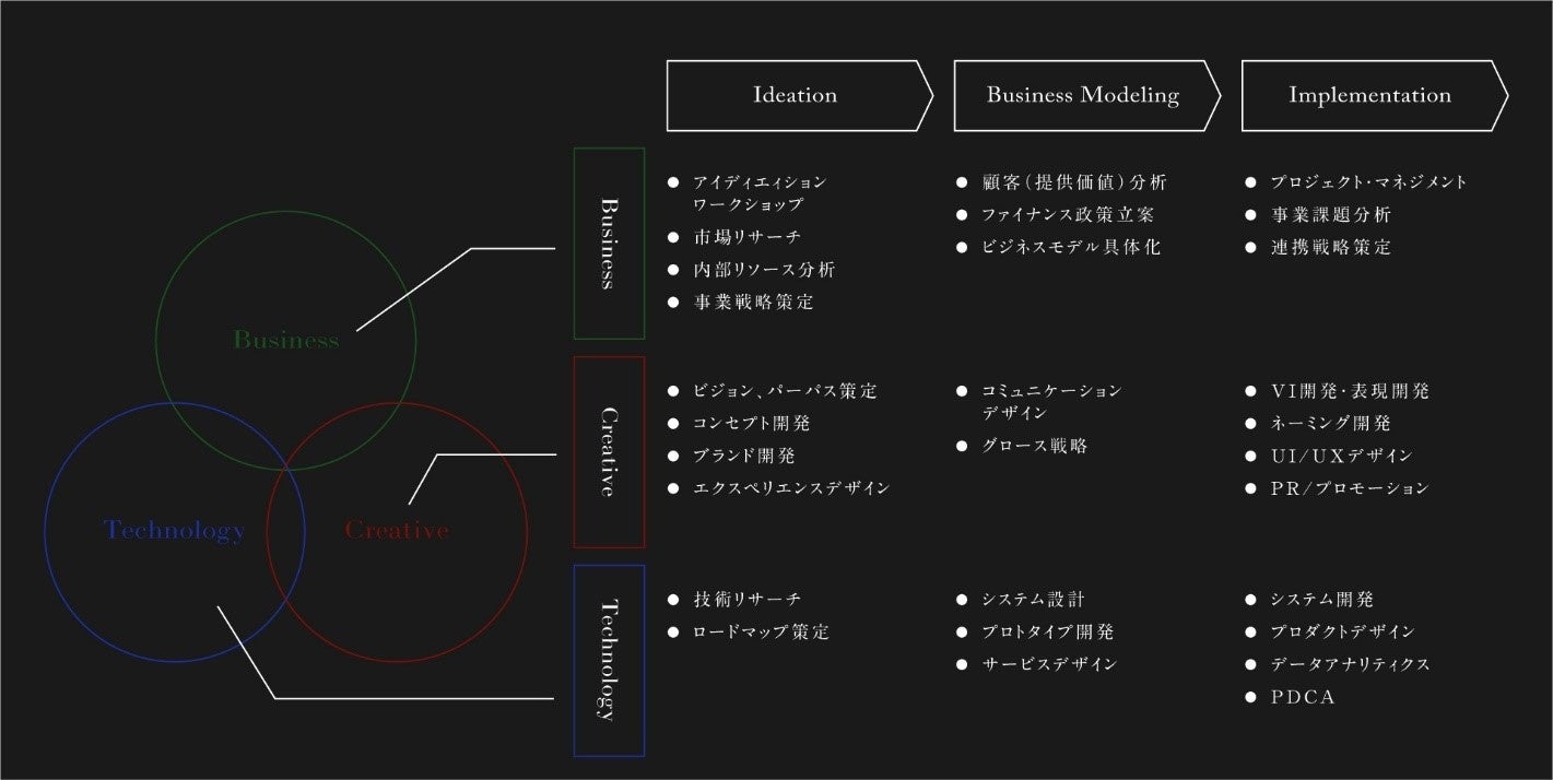 「XX–ダブルエックス-」は、クリエイティブディレクター/エクスペリエンスデザイナーに加えて、戦略コンサルタント/エンジニアなど、ビジネス/テクノロジー/クリエイティブそれぞれの領域に深い知見を持ったプロフェッショナル達がワンチームとなり、事業構想段階から実装段階までの各種ソリューションをワンストップで提供します。