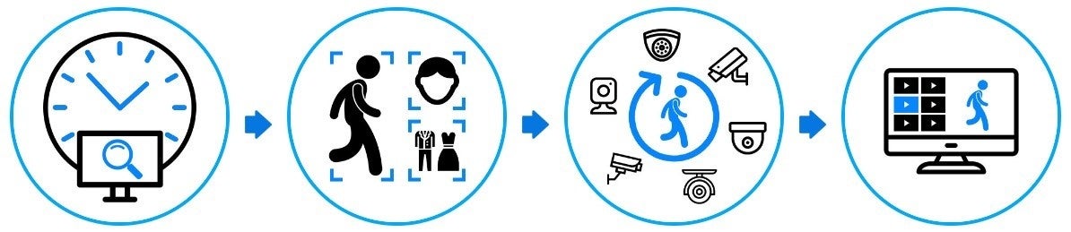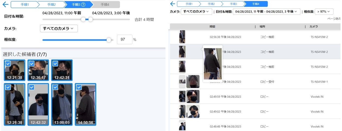 検索対象者の行動遷移を複数の施設やカメラを跨いで照合、48時間以内のすべての行動履歴を表示します。