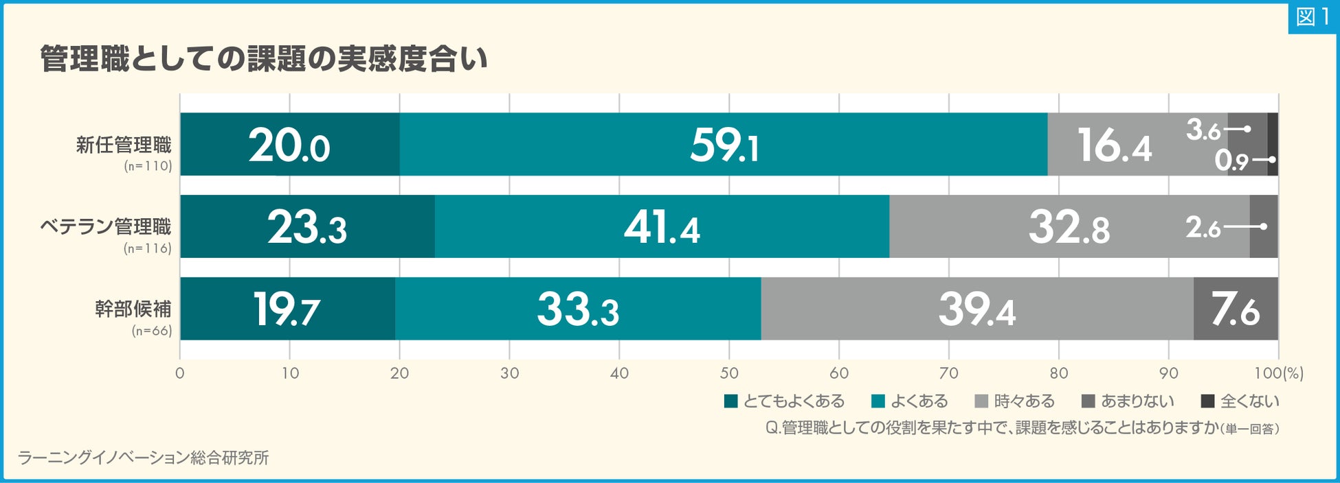 結果、「とてもよくある」「よくある」と回答した割合は、新任管理職では79.1%、ベテラン管理職では64.7%、幹部候補では53.0%となりました。ステージが低い管理職ほど、自身の役割に対して課題を感じやすいことがわかりました。(図1)
