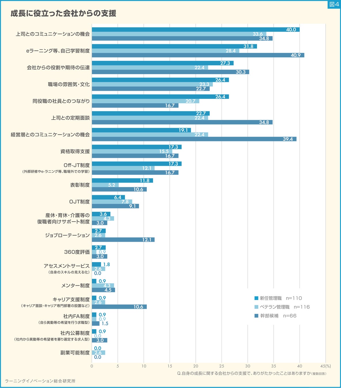 他ステージと比較すると、幹部候補では「eラーニング等、自己学習制度」「上司との定期面談」「経営層とのコミュニケーションの機会」「ジョブローテーション」「キャリア支援制度」が突出しました。(図4)