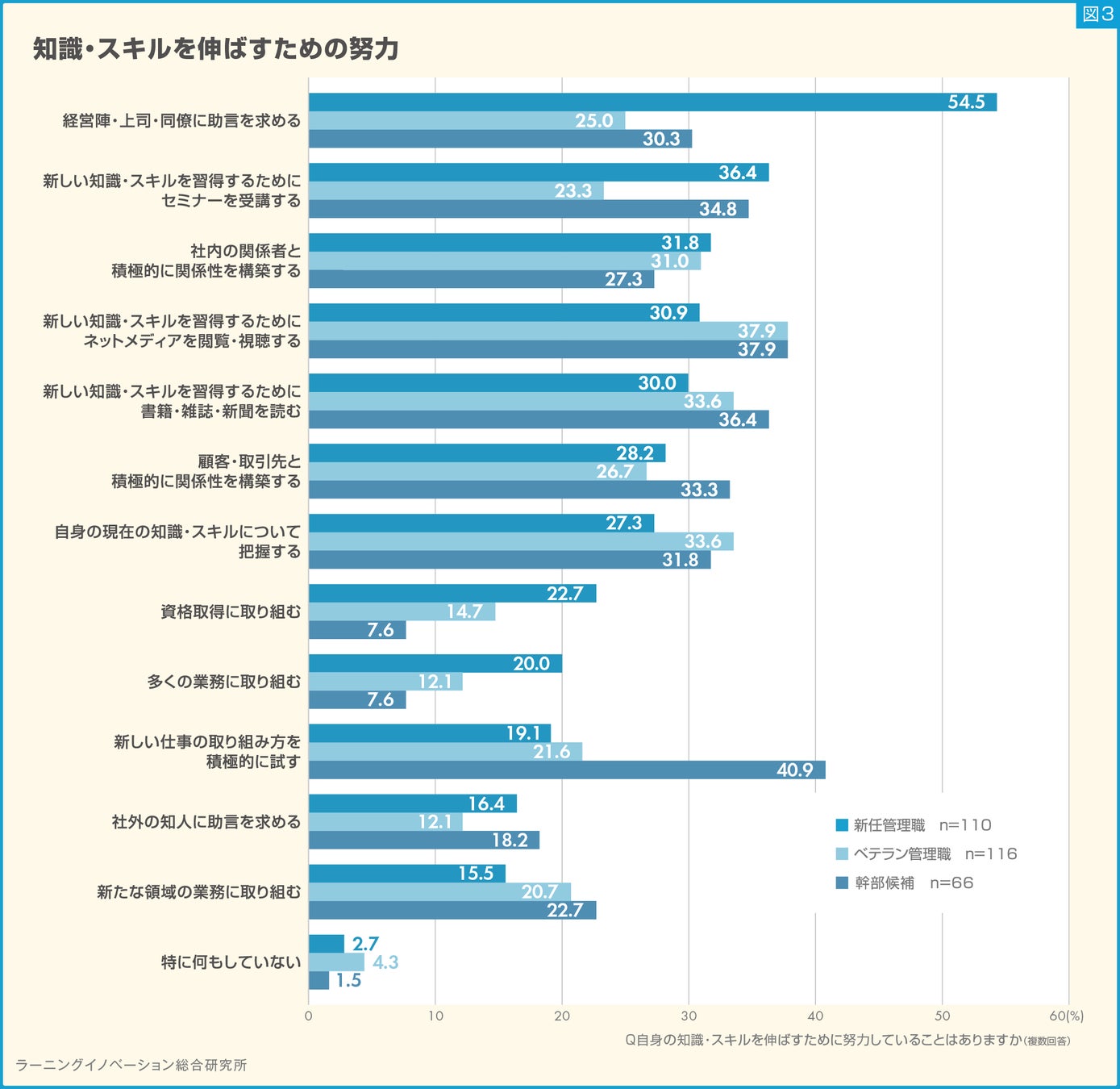 幹部候補は「新しい仕事の取り組み方を積極的に試す」が40.9%となり、他ステージよりも19ポイント以上高い結果となりました。次に、「新しい知識・スキルを習得するためにネットメディアを閲覧・視聴する」が37.9%、「新しい知識・スキルを習得するために書籍・雑誌・新聞を読む」が36.4%と続きました。(図3)