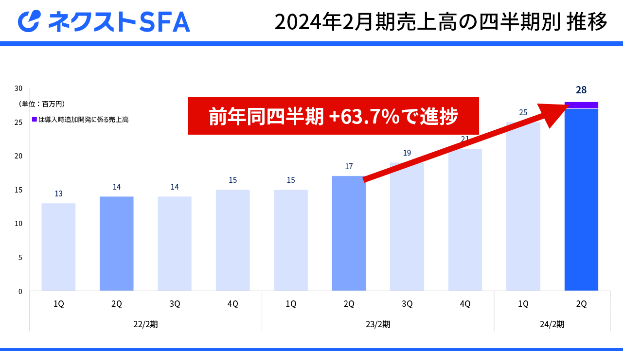 10月13日発表の2024年2月期第2四半期決算では、ネクストSFAの売上高が前年同四半期比+63.7%と大幅に伸びています。