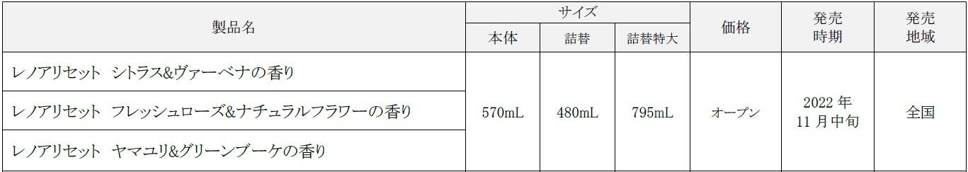 左から、「レノアリセット シトラス&ヴァーベナの香り(本体/詰替)」、「レノアリセット フレッシュローズ&ナチュラルフラワーの香り(本体/詰替)」、「レノアリセット ヤマユリ&グリーンブーケの香り(本体/詰替)」