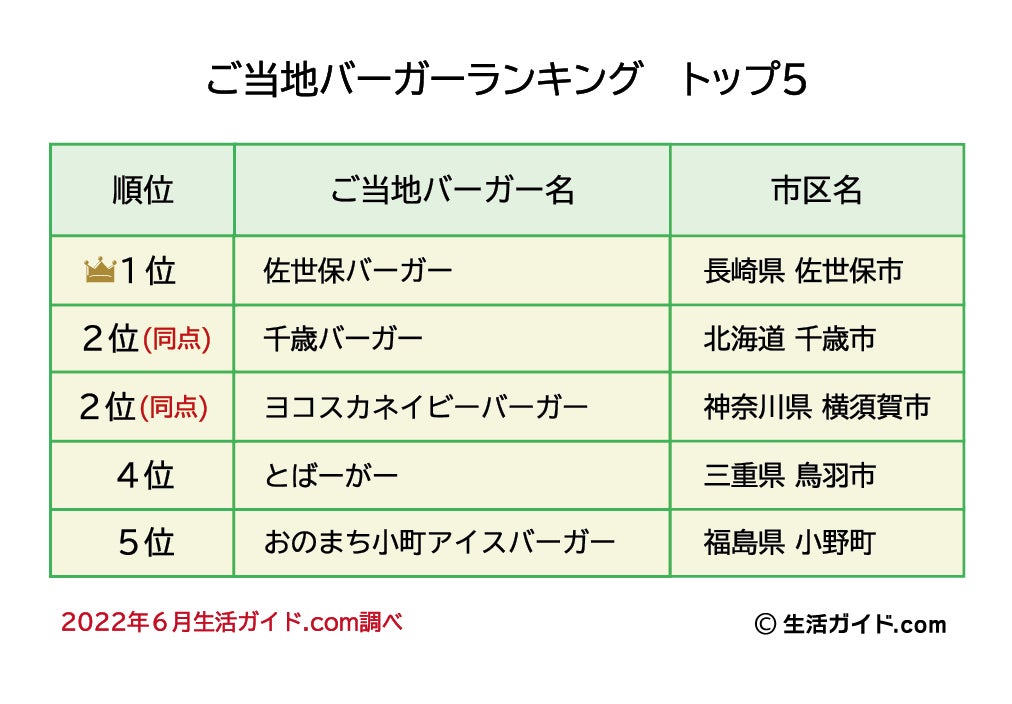 株式会社ウェイブダッシュ(本社:東京都千代田区、代表取締役社長 河野 由紀)が運営する、みんなでつくる地域応援サイト「生活ガイド.com」(https://www.seikatsu-guide.com/) は、みんなのランキング第37回「ご当地バーガーランキング」のトップ5を発表いたしました。
