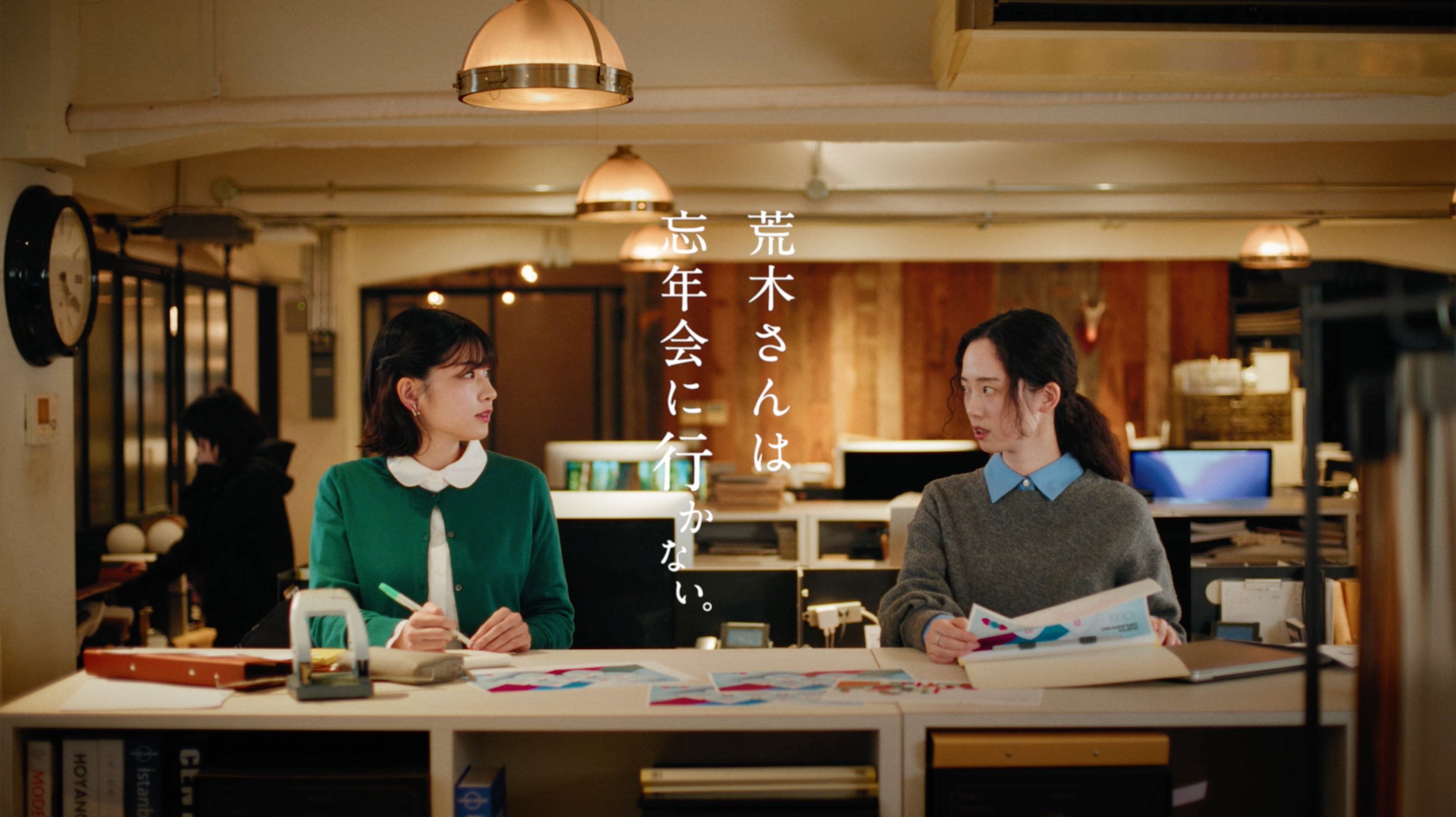 会社員として働きながらモデル・女優として活躍する荒木佐保里さんと、人気ロックバンド、リュックと添い寝ごはんのボーカル・ギターを務める松本ユウさんが会社員役で主演を務め、新しい形の「オフィス忘年会」に参加する様子が描かれています。動画はYouTubeでご覧いただけます。