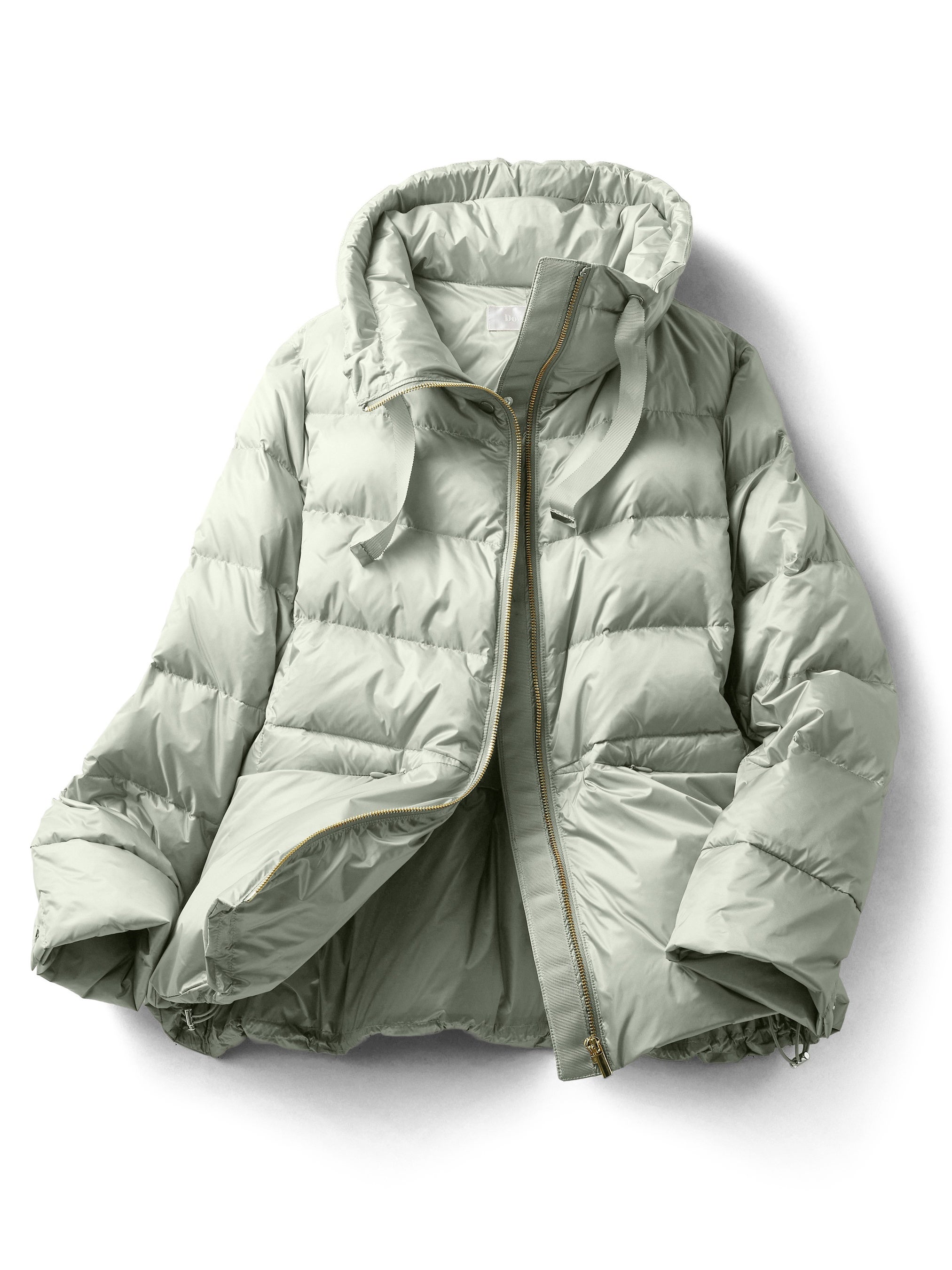 着映えを叶えるのは、ハイブランドのダウンにも使われている、華やかに艶めく20デニールのタフタ生地。上質な生地は、ほんのり透明感があって、見た目もすっきり軽やかな印象です。衿ぐりゆったりのスタンドカラーには、顔まわりをカバーして小顔を演出する効果が。衿を開くと優しい印象になり、その日の気分でアレンジをお楽しみいただけます。