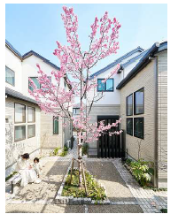 東京都内の狭小住宅地に建つ4 棟の分譲地。共用庭の中心にあるシンボルツリーの桜が各住戸から美しく見えるように計画しました。リビングには庭を眺めながらくつろげる大きなピクチャーウインドウとバルコニーを配置し、共用庭は桜のほかにも四季折々の風景が楽しめるよう植栽を工夫。共用庭の風景は、そこから生まれる対話や共感がコミュニティ意識を育むだけでなく、地域の景観価値も高めます。