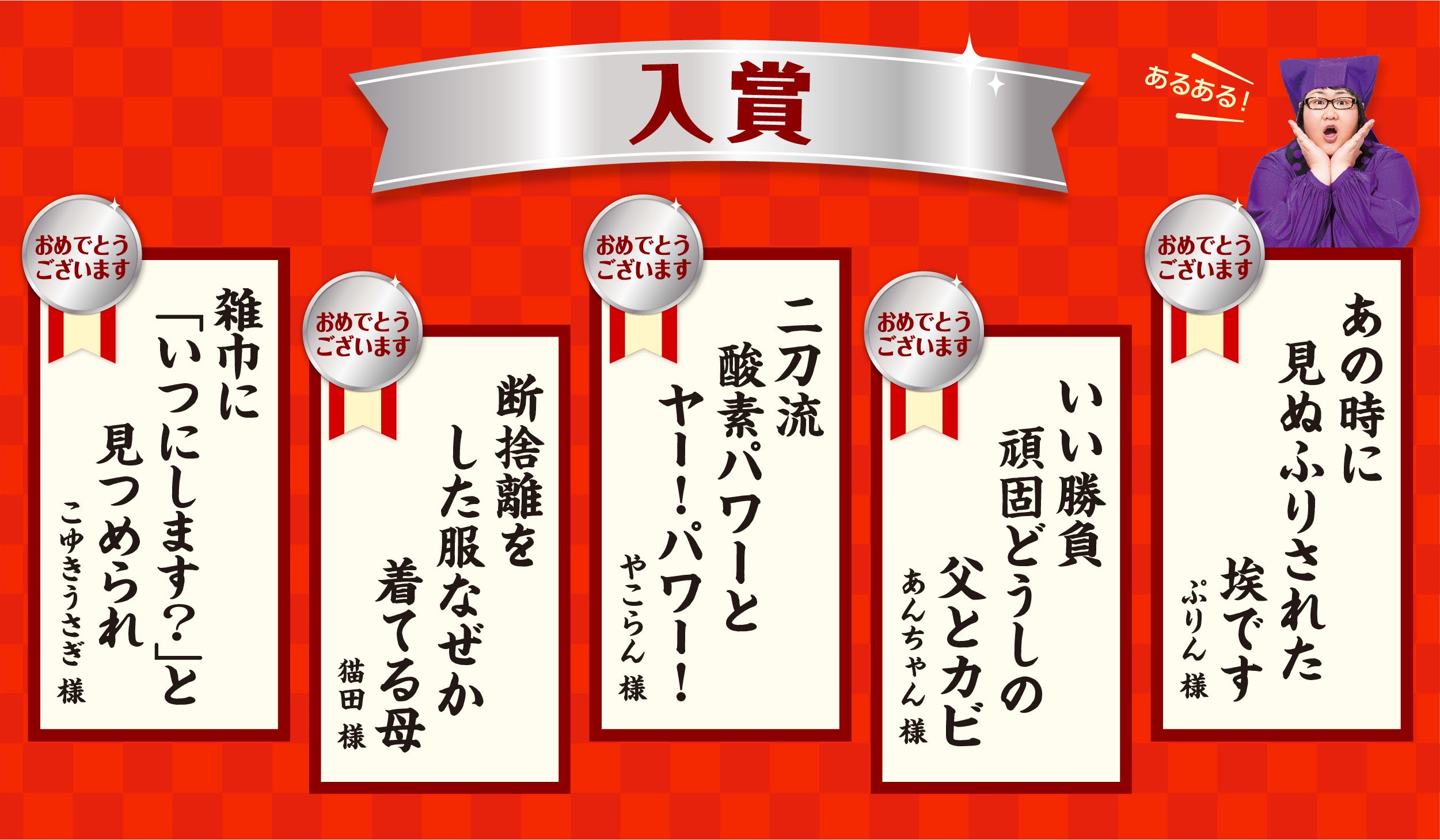 入賞作品には偶然にもお父さん、お母さんとのエピソードが選ばれました。遠いあの日に出会ったホコリとの再会や、雑巾との会話を描いた一句も。流行語にちなんだワードを2つも入れ込んだまさに「二刀流」な作品には審査員もうまい!の一言。