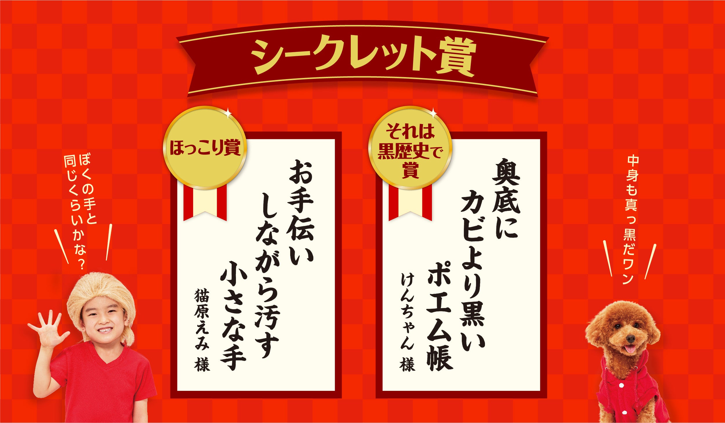 シークレット賞には「ほっこり賞」「それは黒歴史で賞」として2作品が選ばれました。「ほっこり賞」ではお子さんがお手伝いをしようとするかわいらしい様子を想像して審査員も癒されました。対して黒歴史とカビをかけたけんちゃんさんの作品には「ポエム帳は黒すぎる…」と審査員一同苦笑いしてしまいました。