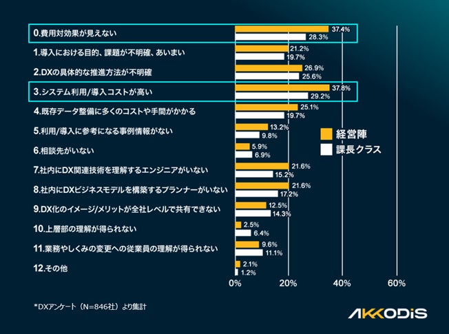 DX導入課題:1位「費用対効果が見えない」、2位「導入コストが高い」