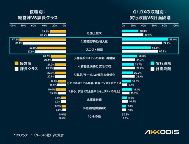 経営層、課長クラスともに「業務効率化/省人化」、「コスト削減」が上位。重要視している項目は、「業務効率化/省人化」、「売上向上」 -