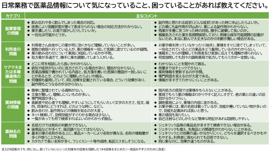 加えて、「日常業務で医薬品情報について気になっていること、困っていることがあれば教えてください」という自由回答(任意)の質問も行いました。回答者547人のうち329人が回答し、そのうち特になし、困っていないといった回答を除外した194回答をまとめた表を下に示します。