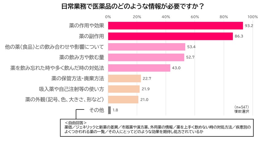 そもそもケアマネジャーが必要とする医薬品情報とはどのようなものなのでしょうか。「日常業務で医薬品のどのような情報が必要ですか?」と質問した回答を下図に示します。