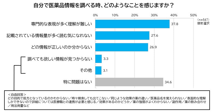 さらに「自分で医薬品情報を調べる時、どのようなことを感じますか?」と尋ねた結果を上図に示します。専門的な表現が多く理解が難しい(37.8%)という回答が最も多く選択されました。次いで、記載されている情報量が多く読む気になれない(27.6%)、どの情報が正しいのか分からない(26.9%)という選択肢が多く選ばれました。逆に、特に問題はないと回答したケアマネジャーは34.6%いました。
