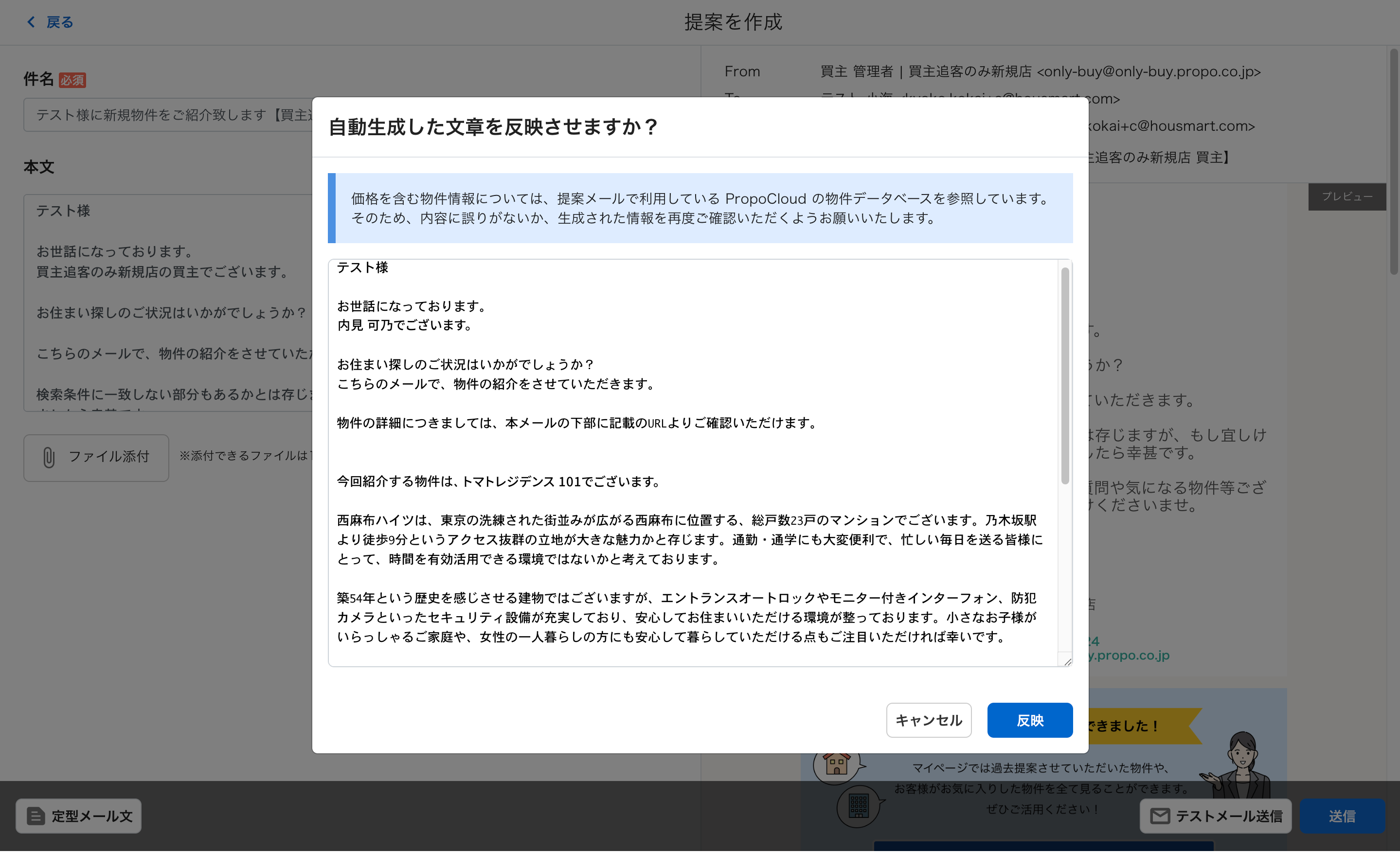 本機能は、「プロポクラウド」が保有する不動産売買仲介に特化した独自の物件データベースから、提案したい物件を選択するだけで、AIがその物件の概要やおすすめポイントをわかりやすく説明する文章を生成します。 本機能により、「プロポクラウド 追客支援」を利用する仲介会社は、生成した文章をメール本文に反映させることで、物件提案にかかっていた時間を削減。メールのフォーマットも仲介会社が利用しやすいように調整されているため、一定のクオリティを担保でき、担当者による対応のばらつきがなくなります。本機能は、仲介会社の業務効率化を促進し、詳細な物件情報を素早く・適切な頻度で買主に届けることができるため、買主の効率的な意思決定を支援します。
