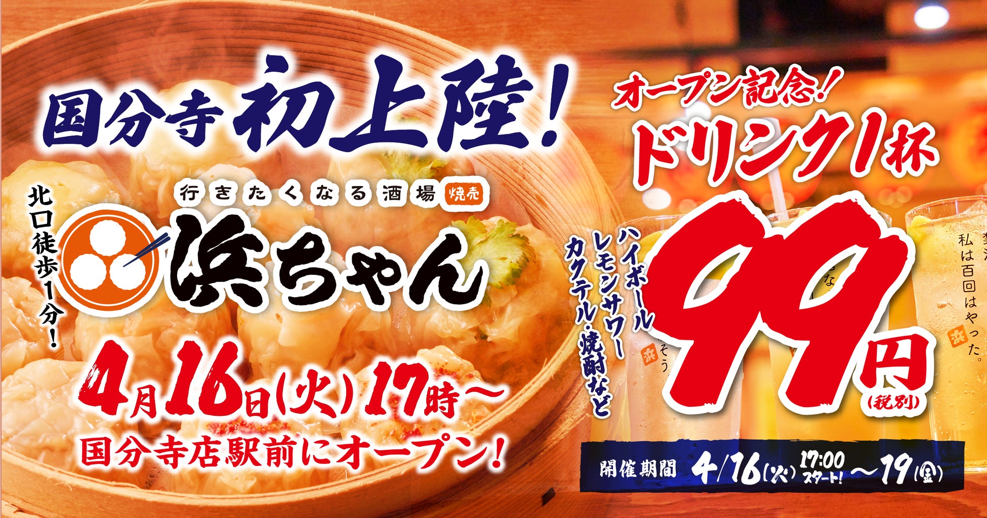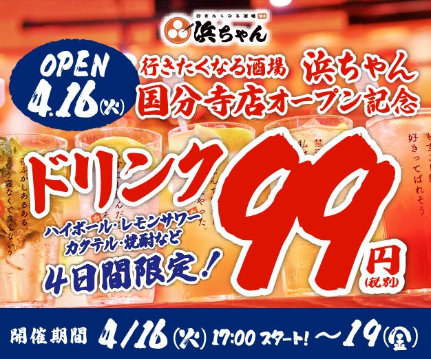 【ドリンク1杯99円】「行きたくなる酒場 浜ちゃん」が4月16日(火)に国分寺初上陸!オープンを記念して自慢のレモンサワーなど1杯99円でご提供!