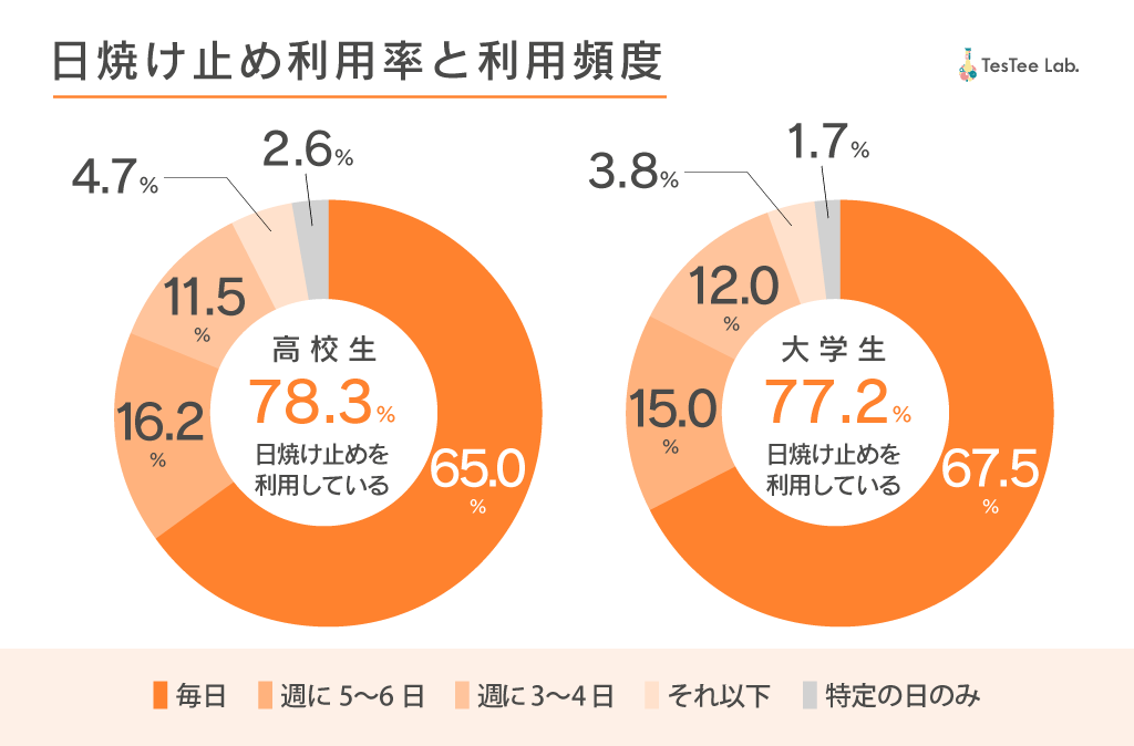 夏場のスキンケア調査において、日焼け止めの利用率を調査したところ、「日焼け止めを利用している」と回答した人は高校生で78.3%、大学生で77.2%となりました。