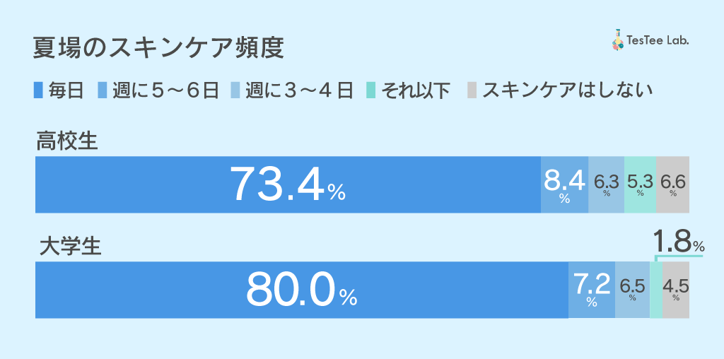 15歳〜24歳(高校生・大学生)の女性831名を対象に、夏場にスキンケアをする頻度を調査したところ、「毎日」と回答した人は高校生で73.4%、大学生で80.0%となりました。