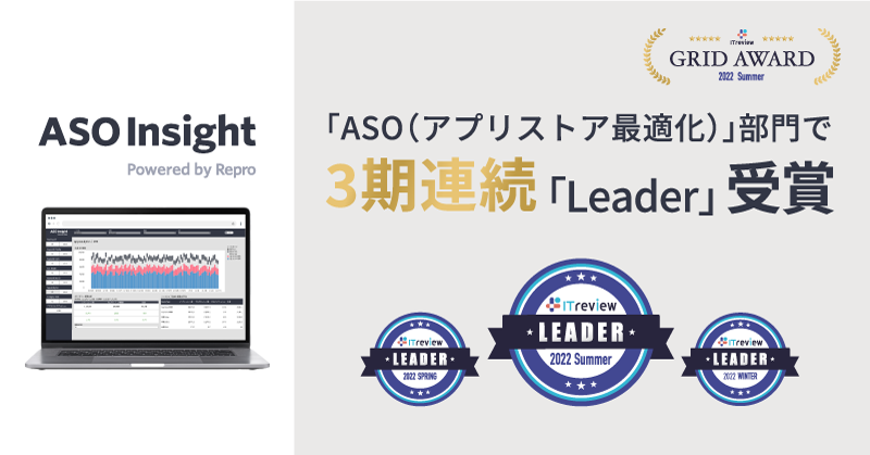 「ASO Insight」は「ITreview Grid Award 2022 Winter」より新設された『ASO(アプリストア最適化)』部門で最高位の「Leader」を初代で受賞し、今回で3期連続受賞しています。