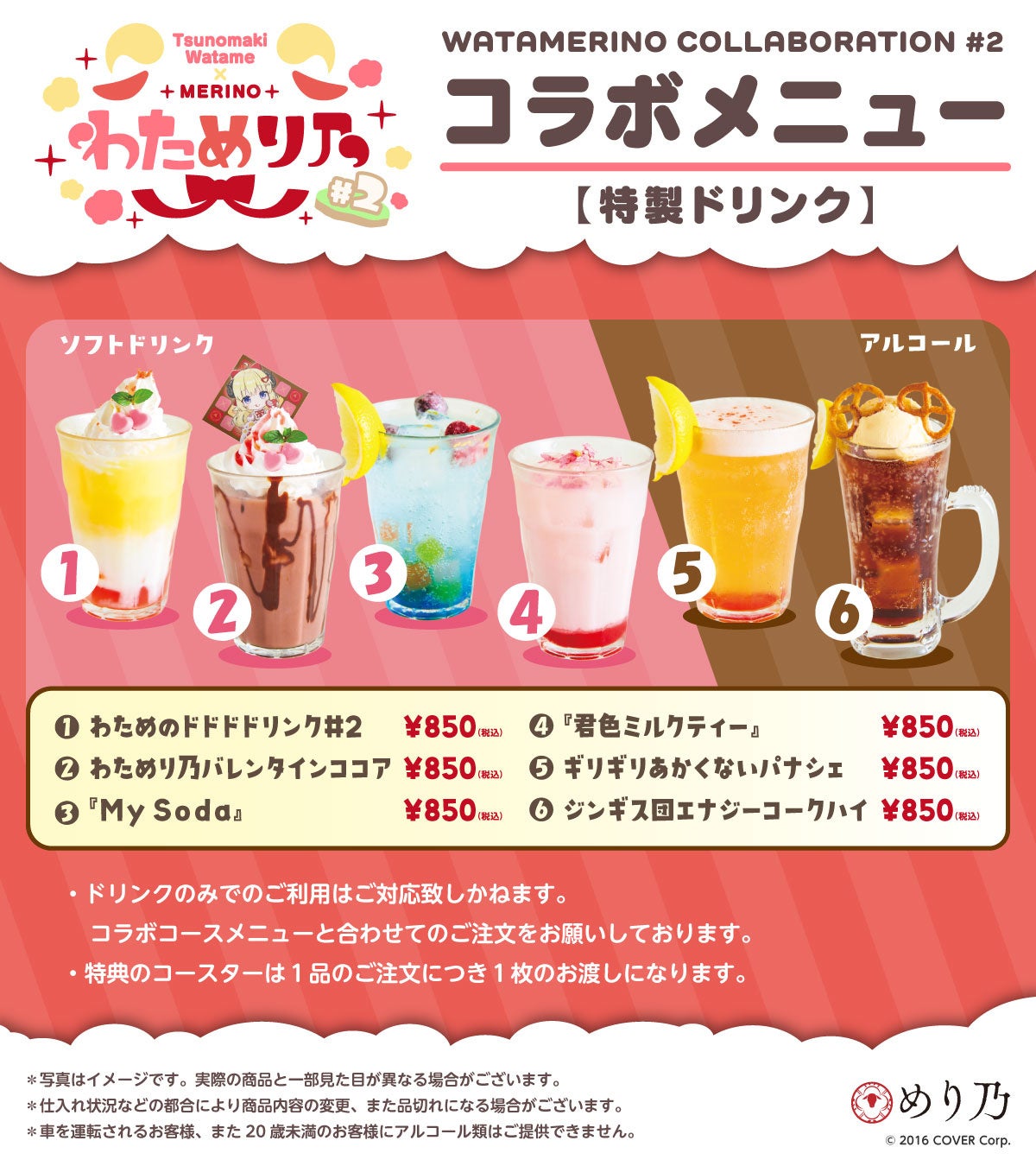 (わためのドドドドリンク#2/わためり乃バレンタインココア/『My Soda』/『君色ミルクティー』/ジンギス団エナジーコークハイ※アルコール/ギリギリ赤くないパナシェ※アルコール)